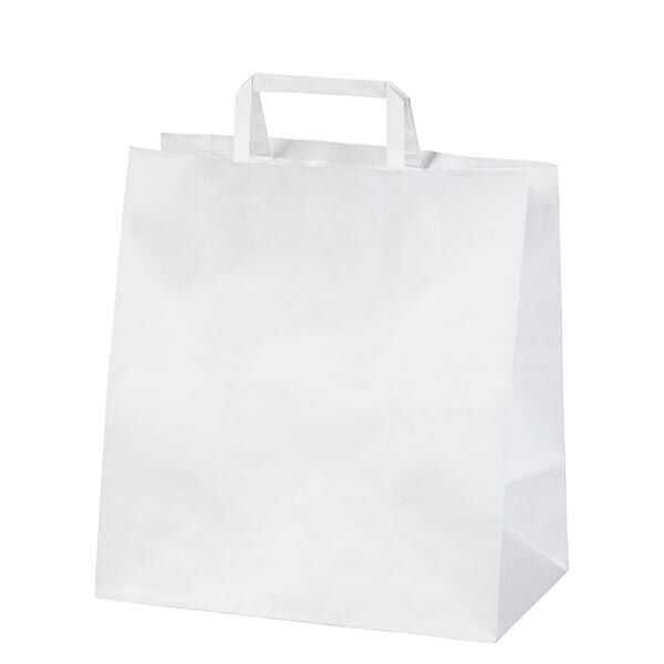 Gelince Haber Ver28 cm eninde, 29 cm boyunda ve 16 cm taban genişliğinde, baskısız, flat (düz) saplı, 70 gr kağıttan (ekonomik), beyaz kraft kağıt çantadır.